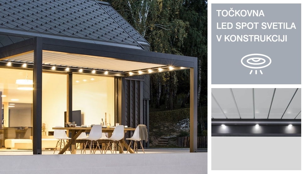 Pergola z zložljivimi lamelami in hermetičnim zapiranjem.